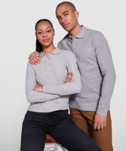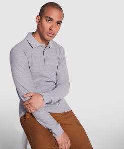 Polo de manga larga, cuello y bocamangas acanalado, tapeta de 3 botones y puños canalé 1×1 con elastano. Cubrecosturas reforzado en cuello.